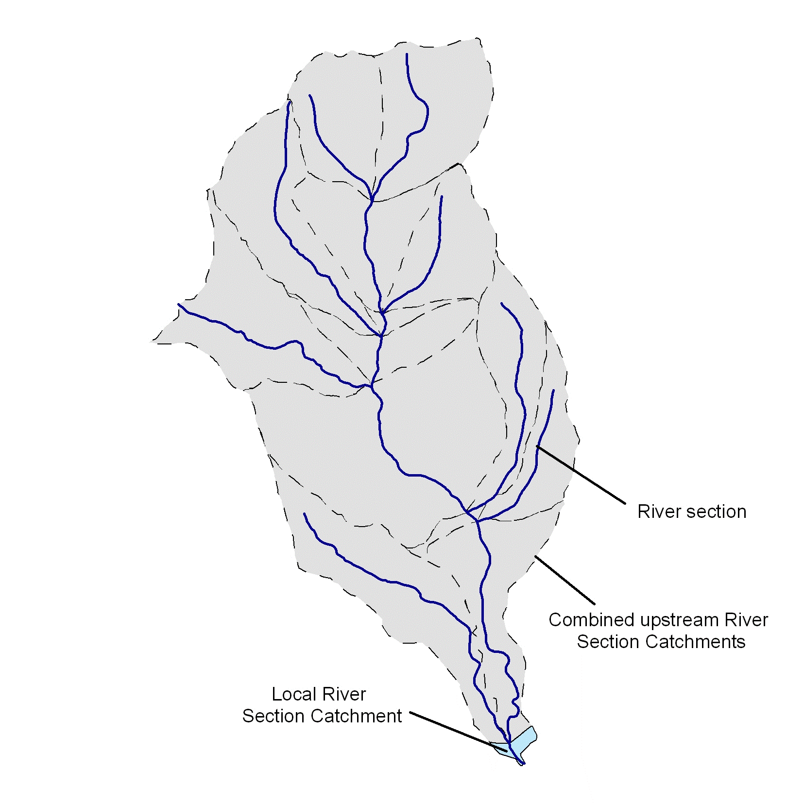 Figure 1. Illustration of catchments showing the local and upstream (consisting of multiple) RSCs. Dotted lines show RSC boundaries.